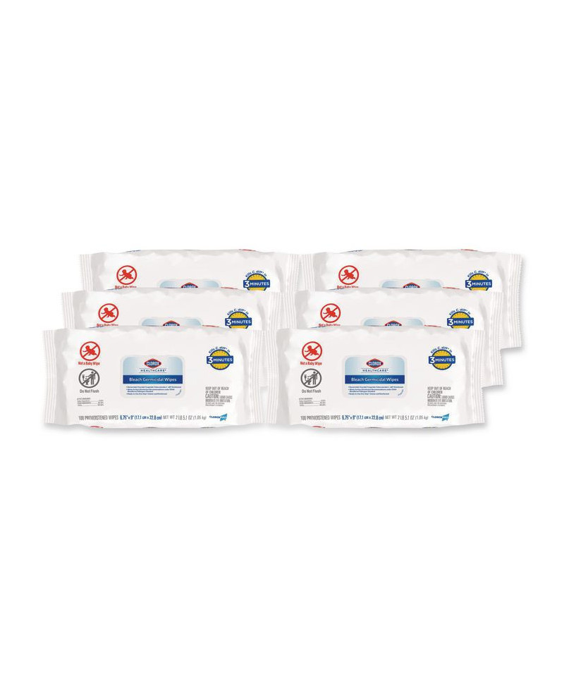 Bleach Germicidal Wipes, Disinfectant Wipes, 1-Ply, 6.75 x 9, Unscented, White, 100 Wipes/Flex-Pack, 6 Flex-Packs/Carton