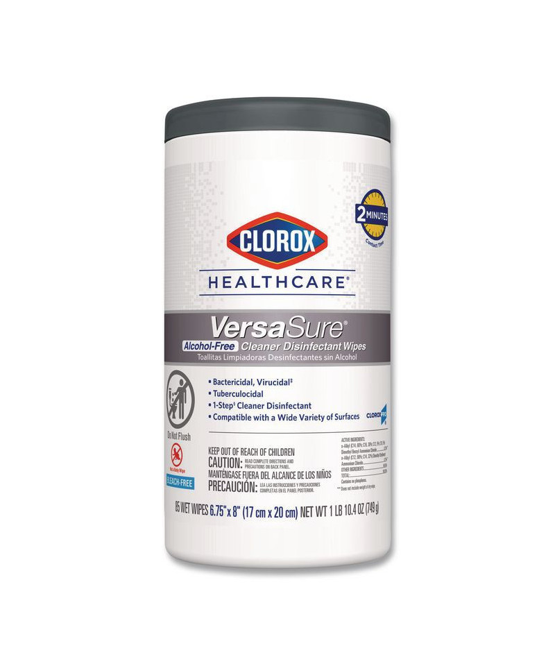 Clorox Healthcare® VersaSure Cleaner™ Disinfectant Wipes kill over 40 pathogens quickly on a broad range of surfaces. These strong and durable clothlike wipes are your alcohol-free solution to cleaning and disinfecting. VersaSure wipes are EPA registered to kill pathogens on hard surfaces in as fast as 30 seconds for most bacteria and viruses, including mumps, measles, MRSA and tuberculosis. These one step disinfecting wipes meet EPA efficacy testing requirements for hospital disinfection, making them great for daily use in your healthcare facility. Designed for patient and staff comfort, the alcohol free quat formula is made with no harsh chemical odors, fumes or added fragrances. The nonwoven wipe does not leave lint on surfaces, and the larger wipe covers more surface area with less effort. Intended for use in healthcare settings.