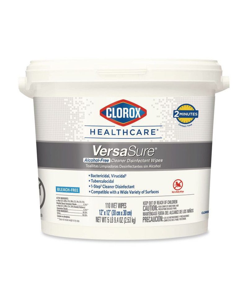 Clorox Healthcare® VersaSure Cleaner™ Disinfectant Wipes kill over 40 pathogens quickly on a broad range of surfaces. These strong and durable clothlike wipes are your alcohol-free solution to cleaning and disinfecting. VersaSure wipes are EPA registered to kill pathogens on hard surfaces in as fast as 30 seconds for most bacteria and viruses, including mumps, measles, MRSA and tuberculosis. These one step disinfecting wipes meet EPA efficacy testing requirements for hospital disinfection, making them great for daily use in your healthcare facility. Designed for patient and staff comfort, the alcohol free quat formula is made with no harsh chemical odors, fumes or added fragrances. The nonwoven wipe does not leave lint on surfaces, and the larger wipe covers more surface area with less effort. Intended for use in healthcare settings.