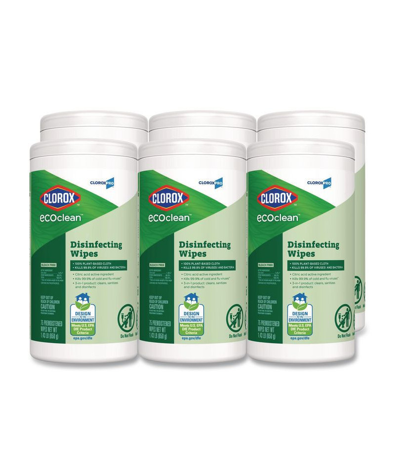 Clorox® EcoClean™. A Clorox clean that's powered by nature. These cleaning and disinfecting wipes are EPA Design for the Environment certified, have a 100% plant-based cloth and are made without bleach, ammonia, alcohol or dyes. They kill 99.9% of germs with a citric acid active ingredient that disinfects, sanitizes, cleans and removes allergens including pet dander, cockroach matter, pollen particles, dust mite particles from high touch surfaces without the need for gloves, goggles or personal protective equipment (PPE) when used as directed. Use them to quickly clean and disinfect kitchen counters, sinks, light switches, door handles, desks and chairs in commercial facilities like schools, colleges, offices, restrooms and hotels. Part of the Clorox® EcoClean™ line of EPA Safer Choice and DFE certified products, EcoClean™ Disinfecting Wipes deliver a clean you can count on. 100% plant-based active ingredient and substrate.