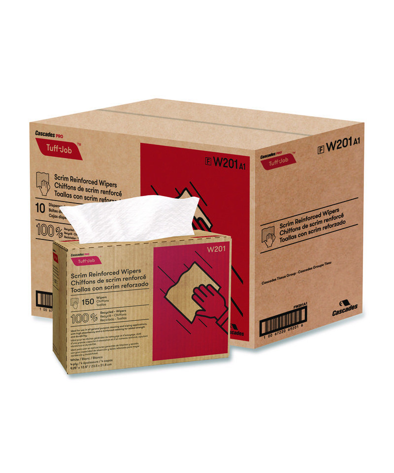 Scrim reinforced wipers are made from four layers of highly absorbent paper. Wipers provide superior wipe-dry performance with low-linting properties. Scrim reinforced web for strength. Wipers perform strong whether wet or dry. They can tackle all cleaning tasks from general purpose to medium duty clean-ups.