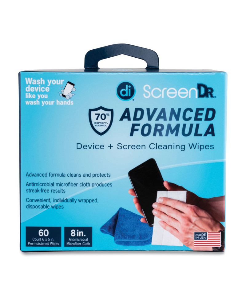 Clean your devices and screens with these advanced formula wipes. The cleaning kit includes individually wrapped premoistened wipes (isopropyl alcohol 70%) along with an antimicrobial microfiber cloth for streak-free results. Wash your device like you wash your hands.