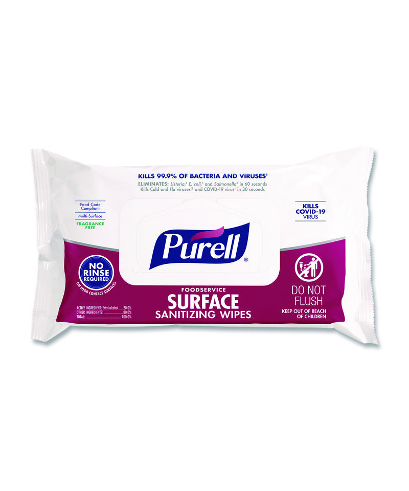 Say hello to PURELL® Foodservice Surface Sanitizing Wipes – your new method to quickly sanitize kitchen, dining, and food-contact surfaces in just one step. These wipes work like magic to wipe out 99.9% of germs without harsh chemicals. They're tough on germs, killing norovirus, E. coli, Salmonella, cold and flu, coronavirus, and more. Meets EPA 60-second no-rinse food-contact sanitization requirements. They help reduce the risk of cross-contamination and are perfect for tackling many items on your cleaning list, including tables, menus, cutting boards, food-prep counters, and cash registers. They also make it easy to sanitize large, hard-to-wash items. Plus, you can clean with confidence, knowing they've earned the EPA's lowest toxicity rating. No gloves, handwashing, or rinsing needed – they're safe on food-contact surfaces and hassle-free! The best part? They're super easy to use; just grab one and wipe away. As a ready-to-use solution, it's the perfect answer for quick and reliable sanitizing, disinfecting, and cleaning.