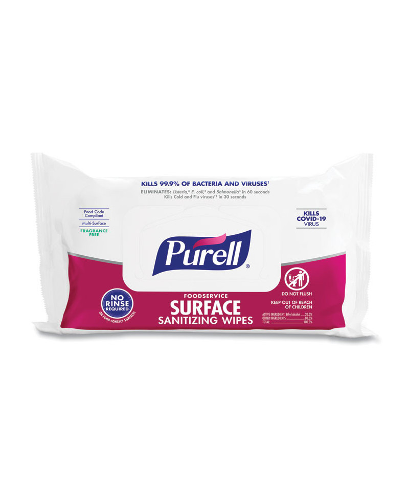 Say hello to PURELL® Foodservice Surface Sanitizing Wipes – your new method to quickly sanitize kitchen, dining, and food-contact surfaces in just one step. These wipes work like magic to wipe out 99.9% of germs without harsh chemicals. They're tough on germs, killing norovirus, E. coli, Salmonella, cold and flu, coronavirus, and more. Meets EPA 60-second no-rinse food-contact sanitization requirements. They help reduce the risk of cross-contamination and are perfect for tackling many items on your cleaning list, including tables, menus, cutting boards, food-prep counters, and cash registers. They also make it easy to sanitize large, hard-to-wash items. Plus, you can clean with confidence, knowing they've earned the EPA's lowest toxicity rating. No gloves, handwashing, or rinsing needed – they're safe on food-contact surfaces and hassle-free! The best part? They're super easy to use; just grab one and wipe away. As a ready-to-use solution, it's the perfect answer for quick and reliable sanitizing, disinfecting, and cleaning.