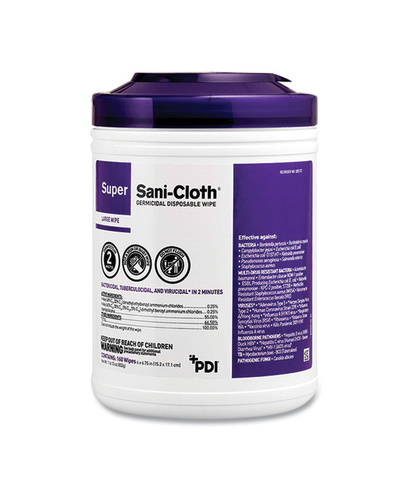 Super Sani-Cloth germicidal disposable wipes are proven effective against enveloped and non-enveloped viruses, fungi, bacteria, multidrug-resistant bacteria and blood-borne pathogens—32 microorganisms in all, including SARS-CoV-2. A fast contact time of just two minutes accommodates quick room turnovers, making them ideal for daily use in fast-paced environments that require short contact times and broad microorganism coverage. Thick and strong with a high fluid capacity, each wipe is also pliable enough to get into tight crevices and corners. Safe for use on a broad range of health-care equipment and most hard, nonporous surfaces. Active ingredient: isopropyl alcohol 55.5%.