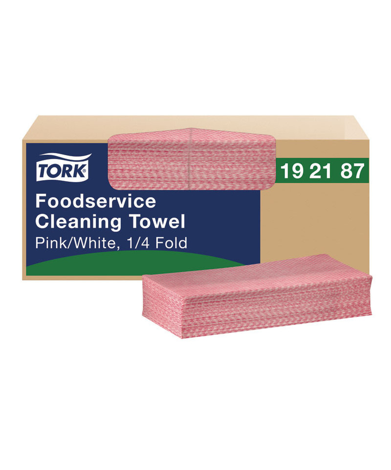 Tork® Foodservice Cleaning Towels are ideal for use in commercial kitchens where hygiene is a top priority. These foodservice towels are compatible with water-based cleaning and sanitizing solutions when the primary task is to deliver sanitizer to hard surfaces. Save staff time thanks to the easy-to-rinse, quick-drying material. Designating area of use by color is a foodservice best practice that reduces the potential for cross-contamination.