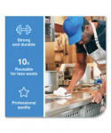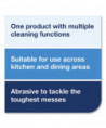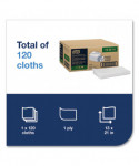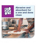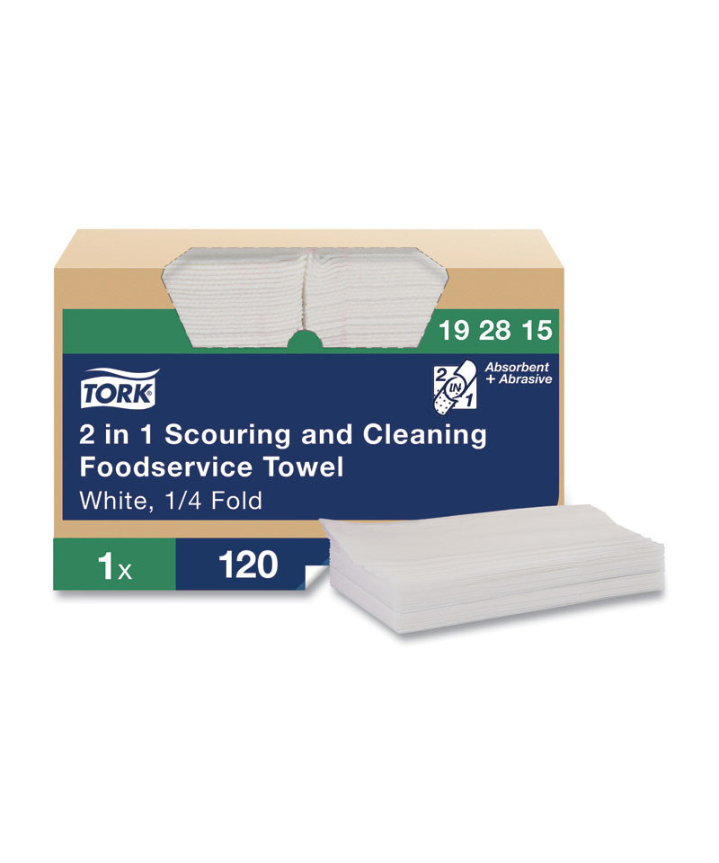 Tork 2 in 1 scouring and cleaning foodservice towels are an abrasive and absorbent foodservice wiper designed for efficient cleaning. They break up harder to clean messes, in both the kitchen and dining areas, yet they won't scratch surfaces. These foodservice wipers can be rinsed and reused again and again for less waste, and they are flexible, so they make it easy to clean in harder to reach places. Can be used as an alternative to scouring sponges and pads. Quat compatible. The wipers come in a self-dispensing box.