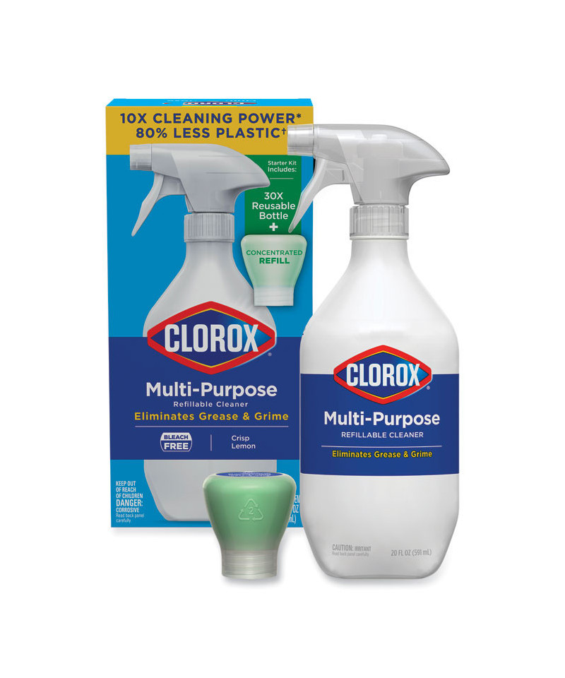 Eliminate grease and grime with 10 times the cleaning power. The Clorox multipurpose refillable bleach-free cleaner starter kit features a reusable bottle and uses recyclable concentrated refills for less waste. Just refill, reload, and reuse.