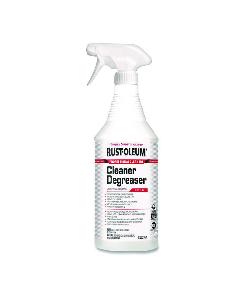 Rust-Oleum Professional Cleaners Cleaner Degreaser quickly removes a variety of tough soils, including grease, oil, paint, adhesive, tar and wax from most non-porous surfaces without leaving a residue. Ideal for industrial cleaning applications and for use on tools, machinery, engine parts, construction equipment, fiberglass, unfinished concrete, masonry, asphalt and more. This fast-acting degreaser is color fast and fabric safe.