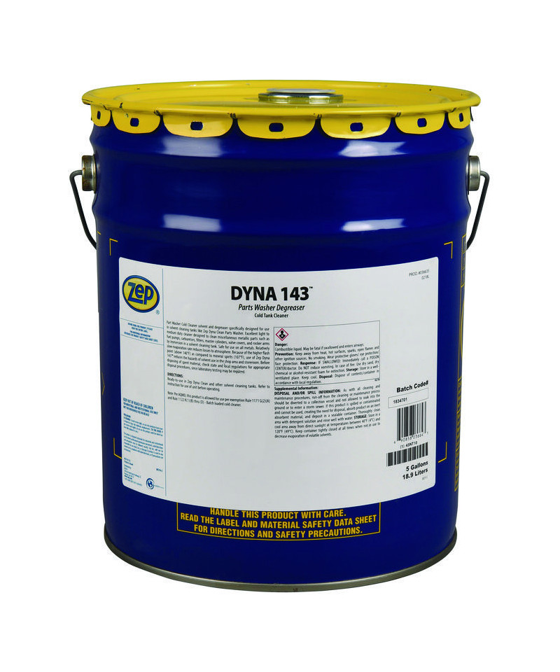 Dyna 143 is specifically designed for use in Zep Parts Washer, Dyna Clean, Dyna Brute FB, Super Brute FB, Zep Brake Buggy and Dyna Mate. Quickly dissolves and flushes away grease and dirt. May be used with a brush or as a dip. Composed of a blend of quality, odorless solvents. Safe to use on all metals. Excellent light-duty cleaner for fuel pumps, carburetors, filters, master cylinders, valve covers, rocker arms, and all engine parts. Ready-to-use. Relatively slow evaporation rate reduces losses to atmosphere. Leaves light oil film on parts to protect against rust and corrosion. Its elevated flash point provides both an added degree of safety in use and storage, and removes the used product from the Hazardous Wastes List, thereby eliminating the headaches and expense involved with disposal.