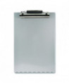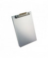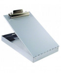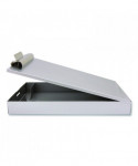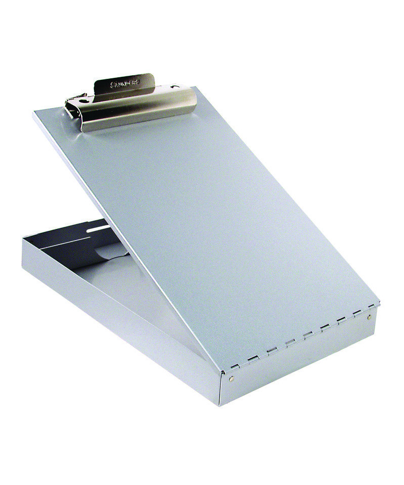 Portable desktop made of durable aluminum, provides a hard surface for readable work and a 1" storage compartment underneath clipboard cover with separate section for pens and pencils. Self-locking latch keeps the compartment securely fastened. High-capacity clip holds up to 1" paper and includes a built-in license/card holder.