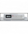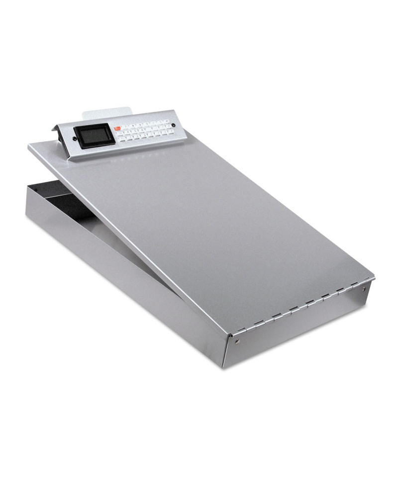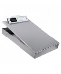 Portable desktop made of durable aluminum, provides a hard surface for readable work and a 1" storage compartment underneath clipboard cover with separate section for pens and pencils. Self-locking latch keeps the compartment securely fastened. High-capacity clip holds up to 1" paper and includes a built-in license/card holder.