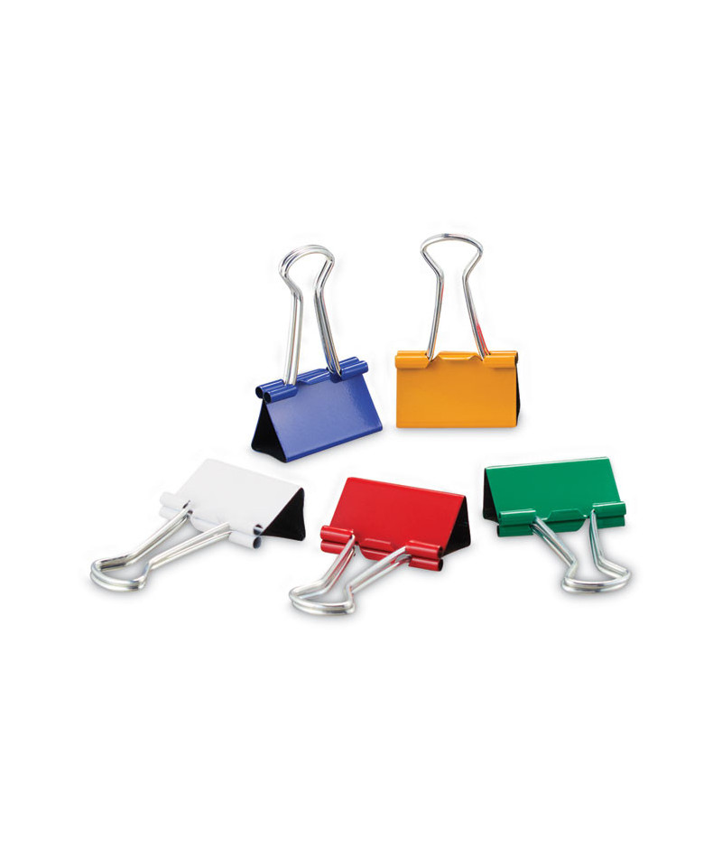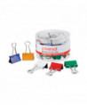 Metal binder clips in assorted colors for easy color coding. Handy tub for storage.