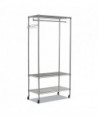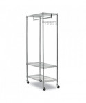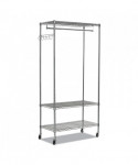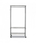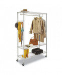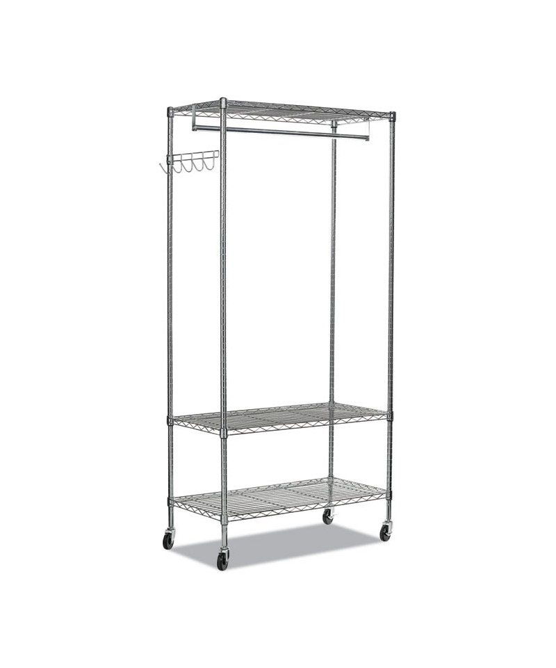 Time-saving design assembles in minutes without tools. Strong welded wire construction that allows air circulation and helps reduce dust buildup. Double-sided for quick access to items. Rack features hanging rod for garments, five support hooks for umbrellas, bags, and other items to accommodate your needs. Three shelves adjust in 1" increments and support 350 lbs. on each shelf. Four casters for quick mobility and two lock when it has reached your destination. Total unit capacity is 500 lbs. if used with casters. Hangers not included.