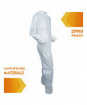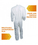 These liquid and particle protection coveralls are made of microporous film laminate with zipper front, flap over zipper and elastic in the back for improved protection.