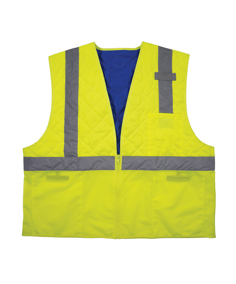 This hi-vis safety cooling vest is made with advanced polymer-embedded technology that quickly activates with water to provide hours of core cooling relief. This cooling vest consists of three layers: an ANSI/ISEA 107 Type R, Class 2 high visibility shell, a polymer-embedded mid-layer and a water-repellent liner to help keep wearers dry. This comfortable cooling vest is designed to be lighter and less bulky than most cooling vests on the market. Breathable mesh along the bottom of the vest reduces weight, enhances airflow and prevents excess water from dripping onto clothing. Loops along the interior of the neckline allow wearers to insert cooling towels for additional cooling relief along the neck. Also features two lower interior pockets for storage, and a zippered closure for easy on/o