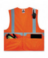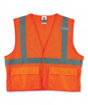 Class 2 standard mesh fabric vest with hook and loop closure. ANSI-compliant polyester mesh (3.3 oz). 2 ANSI-compliant reflective. One inside, two outside pockets. Single radio mic tab.