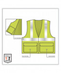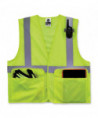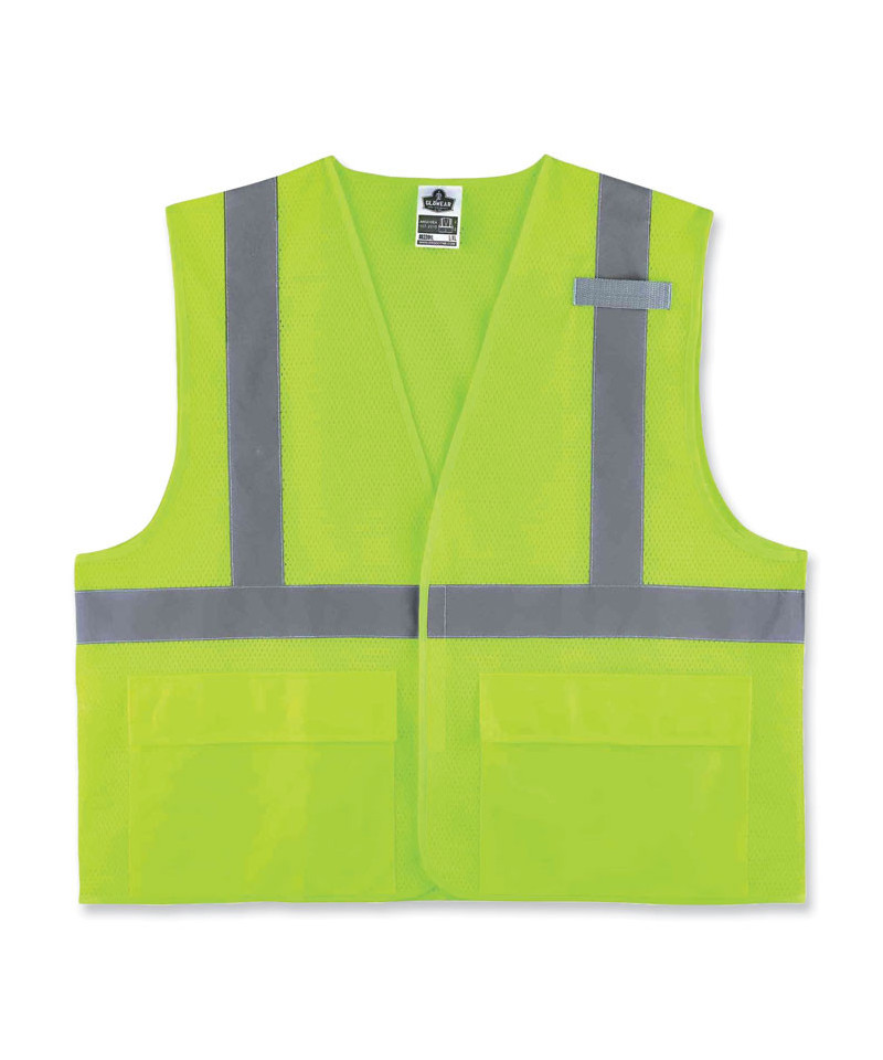 Class 2 standard mesh fabric vest with hook and loop closure. ANSI-compliant polyester mesh (3.3 oz). 2 ANSI-compliant reflective. One inside, two outside pockets. Single radio mic tab.