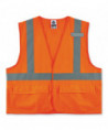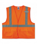 Class 2 standard solid fabric vest with hook and loop closure. ANSI-compliant polyester solid (3.6 oz). 2 ANSI-compliant reflective. One inside, two outside pockets. Single radio mic tab.