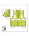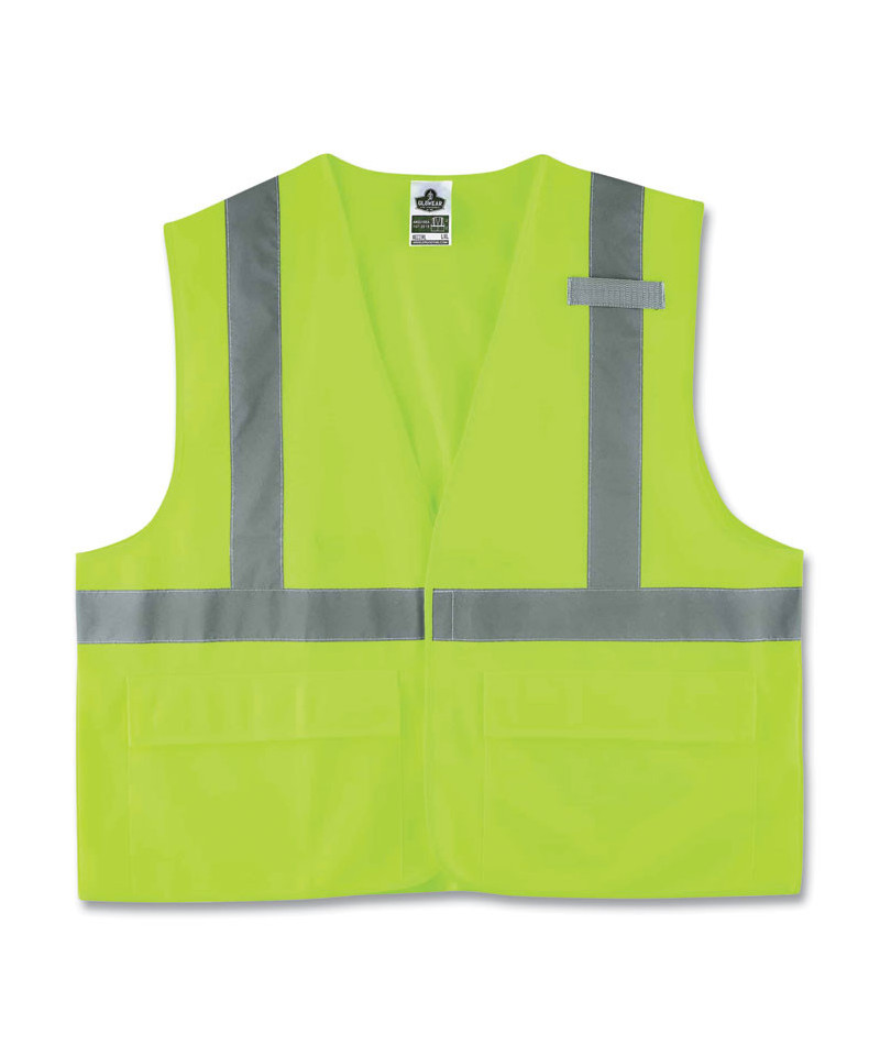 Class 2 standard solid fabric vest with hook and loop closure. ANSI-compliant polyester solid (3.6 oz). 2 ANSI-compliant reflective. One inside, two outside pockets. Single radio mic tab.