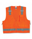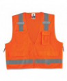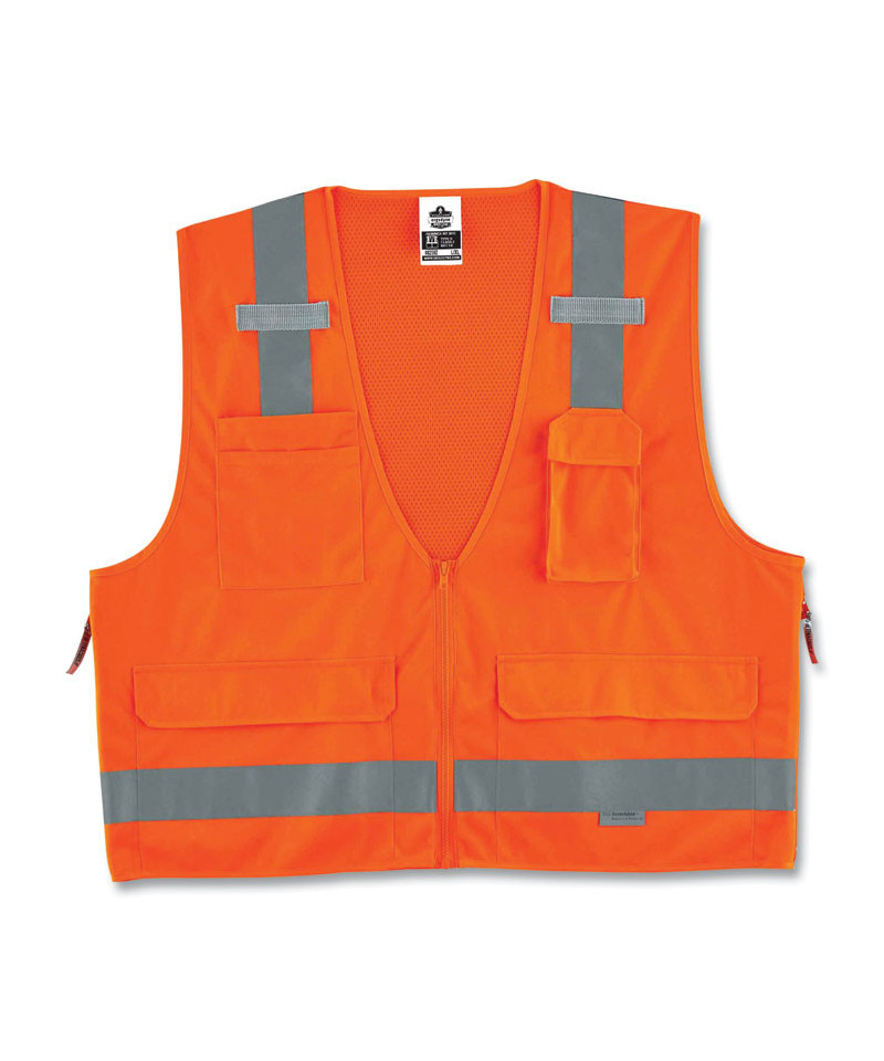 Pockets, pockets, pockets! Class 2 Surveyors Vest with solid front, mesh back and zipper closure. Two inside and four outside pockets. One large zippered rear document/tablet pocket. Features 2 ANSI-compliant 3M Scotchlite Reflective. Dual radio mic tabs.