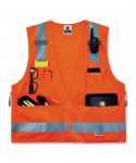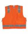 Pockets, pockets, pockets! Vest with solid front, mesh back and zipper closure. Two inside and four outside pockets. One large zippered rear document/tablet pocket. Features 2 ANSI-compliant 3M Scotchlite Reflective. Dual radio mic tabs.