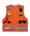 Pockets, pockets, pockets! Class 2 Surveyors Vest with solid front, mesh back and zipper closure. Two inside and four outside pockets. One large zippered rear document/tablet pocket. Features 2 ANSI-compliant 3M Scotchlite Reflective. Dual radio mic tabs.