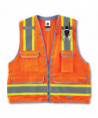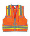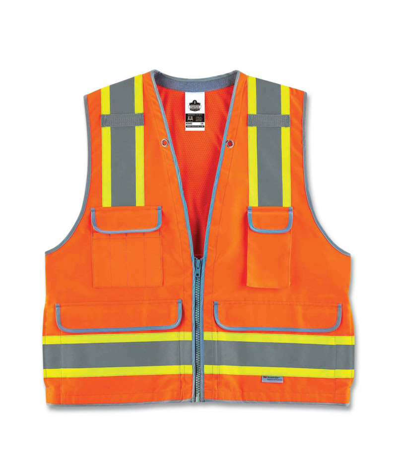 Class 2 Heavy-Duty Surveyors Vest offers serious visibility for serious professionals. Rugged materials and storage galore, this is your new favorite vest. Heavy-duty #10 zipper closure. 2 ANSI-compliant 3M Scotchlite Reflective. Reflective set on 3.5 contrasting background. Four outside pockets and one large zippered rear document/tablet pocket. Dual radio mic tabs.