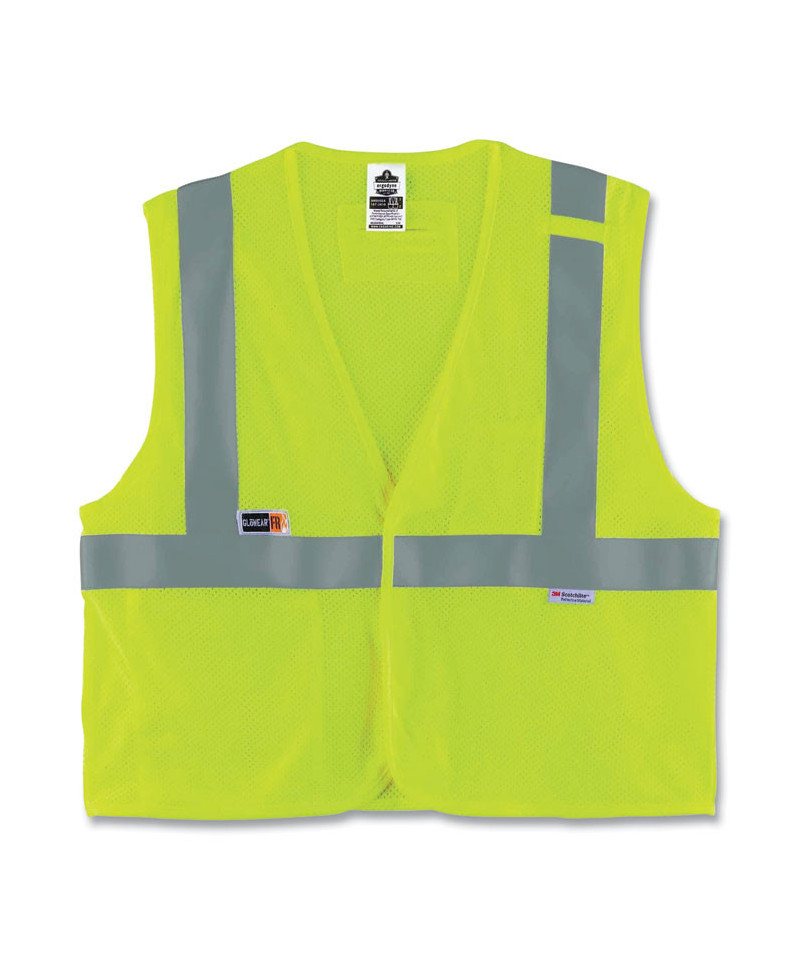 The GloWear 8260FRHL Hi-Vis FR Safety Vest is a Type R Class 2 vest compliant to ASTM F1506 for flame resistance. Designed to be worn as part of a complete fire-resistant (FR) garment system, this ANSI-compliant mesh work vest is tested and certified to an ATPV 4.6 cal/cm2. This ASTM F1506 and ANSI/ISEA 107 compliant Class 2 safety vest is made from GlenGuard FR Fabric with a 5.6 oz modacrylic mesh body and binding for increased airflow and breathability. This reflective vest also features a 2 ANSI-Compliant 3M Scotchlite FR reflective accents for heightened visibility at night or in low light environments. Included in the vest are one interior pocket, one dual pen pocket and a single fire-resistant radio mic tab. There is D-ring access on the back and a hook and loop closure for easy on/off. Ideal for electrical, petrochemical, oil and gas and refinery work.