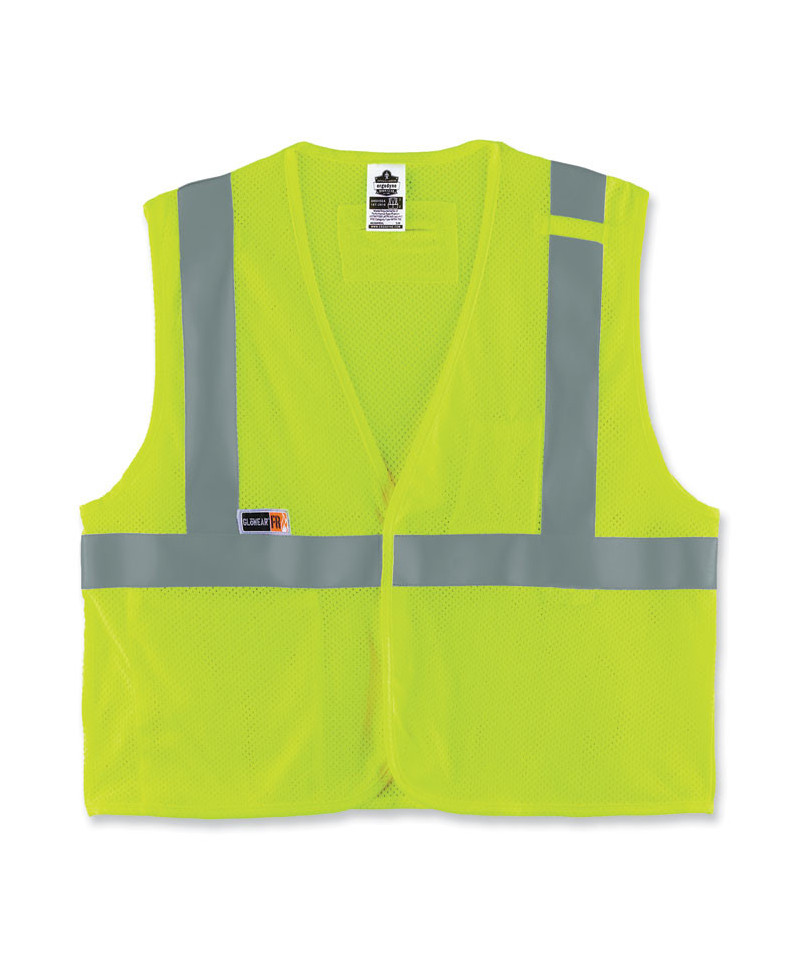 The GloWear 8263FRHL FR Safety Vest is a Type R Class 2 vest compliant to ASTM F1506 for flame resistance. Designed to be worn as part of a complete fire-resistant (FR) garment system, this ANSI-approved mesh work vest is tested and certified to an ATPV 5.1 cal/cm˛, NFPA 70E CAT 1. FR and ANSI 107 Compliant. Made of 60% modacrylic mesh and 40% cotton for comfort and breathability. This reflective vest also features a 2" FR reflective tape for heightened visibility at night or in low-light environments. Includes one interior pocket, one dual pen pocket and a single flame-resistant radio mic tab. D-ring access on the back for wearing over fall protection harnesses, and a hook and loop closure for easy on/off. This FR high-visibility vest is ideal for workers in occupations with electrical arc flash risk, including electrical and utilities.