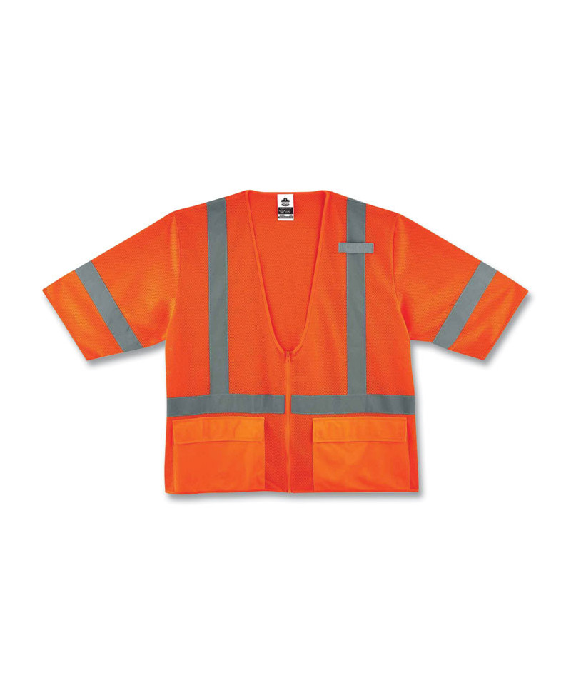 Class 3 standard vest constructed of mesh fabric. Features zipper closure and 2 ANSI-compliant reflective. One inside and two outside pockets for keeping important items close at hand. Single radio mic tab.