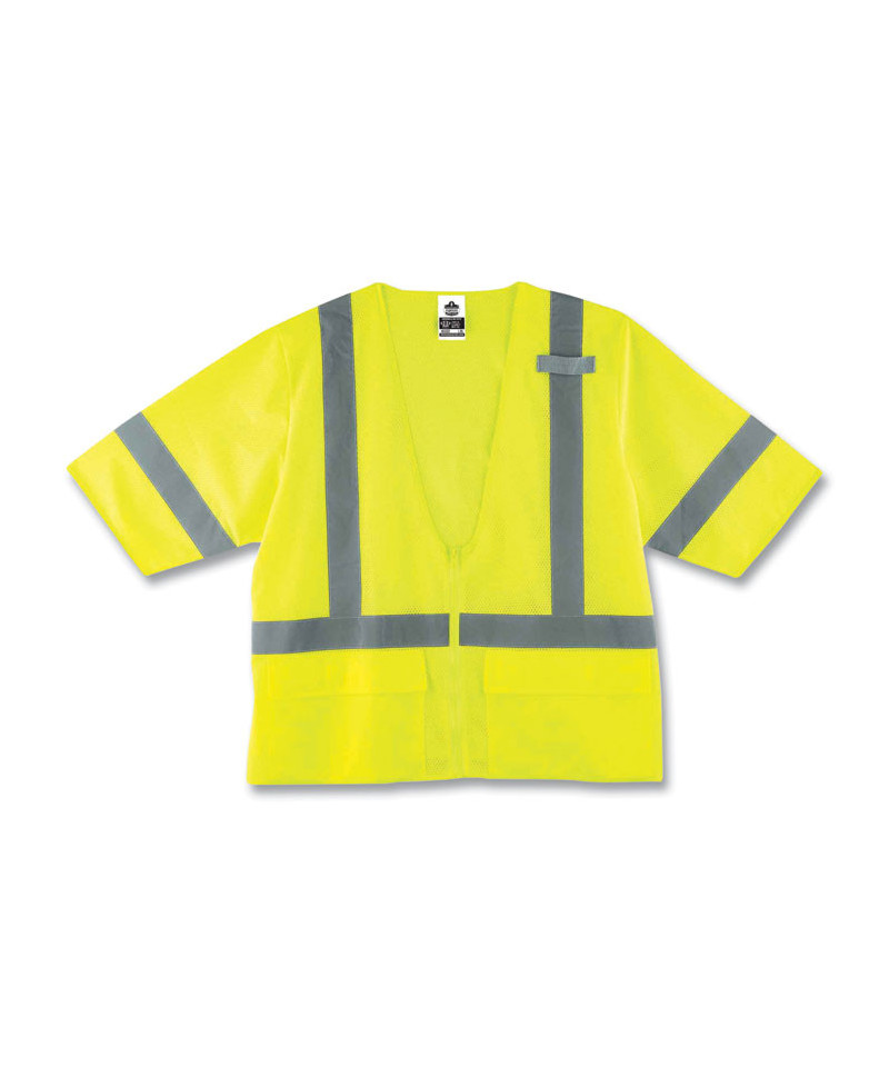 Class 3 standard vest constructed of mesh fabric. Features zipper closure and 2 ANSI-compliant reflective. One inside and two outside pockets for keeping important items close at hand. Single radio mic tab.