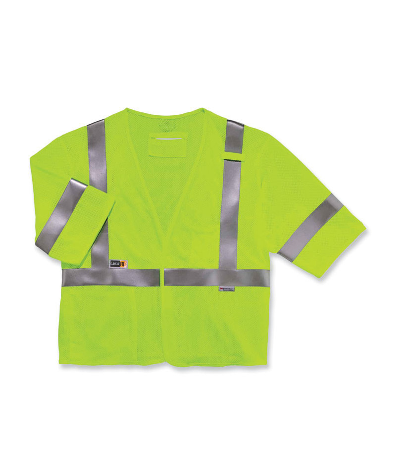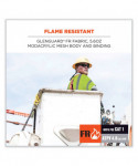 The GloWear 8356FRHL Hi-Vis FR Safety Vest is a Type R Class 3 vest compliant to ASTM F1506 for flame resistance. Designed to be worn as part of a complete flame-resistant garment system, this ANSI-compliant mesh work vest is tested and certified to an ATPV 4.6 cal/cm2. This ASTM F1506 and ANSI/ISEA 107-compliant Class 3 safety vest is made from GlenGuard FR Fabric with a 5.6 oz modacrylic mesh body and binding for increased airflow and breathability. This reflective vest also features 2 ANSI-Compliant 3M Scotchlite FR reflective tape for heightened visibility at night or in low light environments. Included in the vest are one interior pocket, one dual pen pocket and a single fire-resistant radio mic tab. There is D-ring access on the back and a hook and loop closure for easy on/off. This FR high-visibility clothing is ideal for electrical, petrochemical, oil and gas and refinery work.