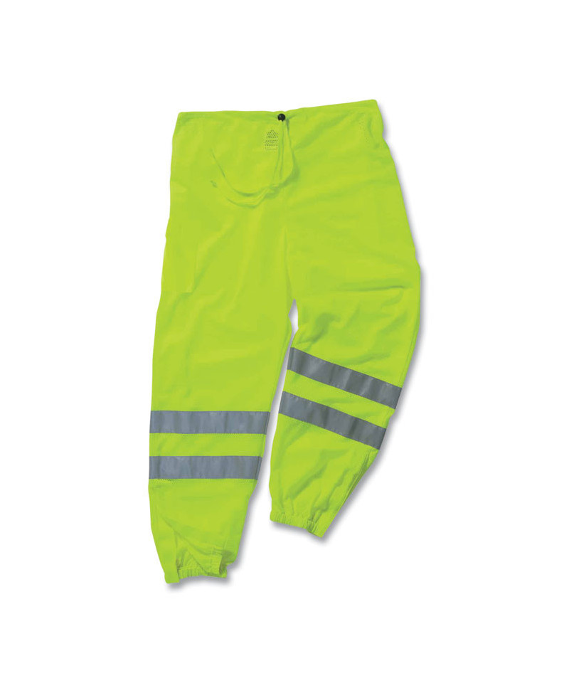Class E hi-vis cool mesh pants have wide leg openings with hook and loop for easy off and on. Features 2" ANSI-compliant reflective, a drawstring waist and one right leg cargo pocket.