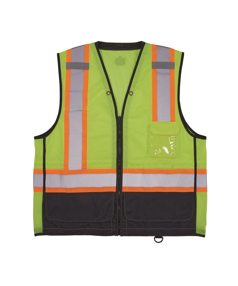 The GloWear 8251HDZ Class 2 Two-Tone Hi-Vis Safety Vest is an ANSI-compliant vest designed with a 100% polyester mesh back, solid polyester material on the front and a black panel across the bottom front to hide dirt, grit and dust to keep the vest looking cleaner longer. This hi-vis vest features 2" reflective tape for enhanced low-light visibility and features a zipper closure makes for easy on and off. This vest features three interior pockets with reinforced corners-one upper chest hook and loop pocket for cell phones, one large lower hook and loop pocket for tablets and a smaller lower hook and loop pocket for storage of pens, small tools and more. The exterior features two lower flap pockets and a dual-layer chest pocket with a clear window ID holder and a pocket on the backside to store pens, markers, boxcutters and keys. Dual mic tabs, two grommet holes and one D-ring are strategically placed for convenient access. Machine washable.