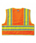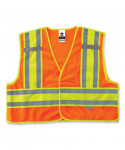 ANSI-compliant, two-tone public saftey vest with a breakaway design. Solid poly front with mesh back. Reflective strip set on 4.5 contrasting background for extra visibility. Features one multi-division inside pocket and dual radio mic tabs.