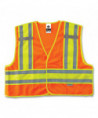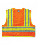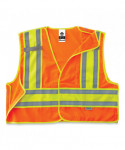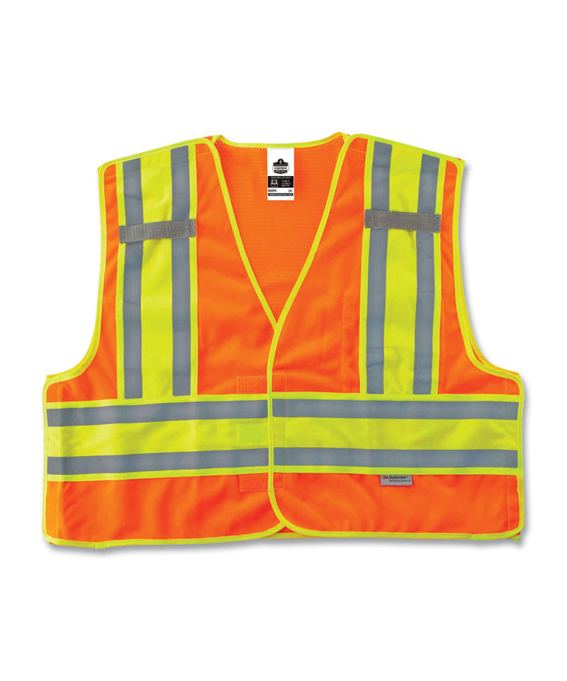 ANSI-compliant, two-tone public saftey vest with a breakaway design. Solid poly front with mesh back. Reflective strip set on 4.5 contrasting background for extra visibility. Features one multi-division inside pocket and dual radio mic tabs.