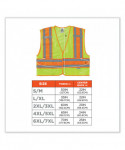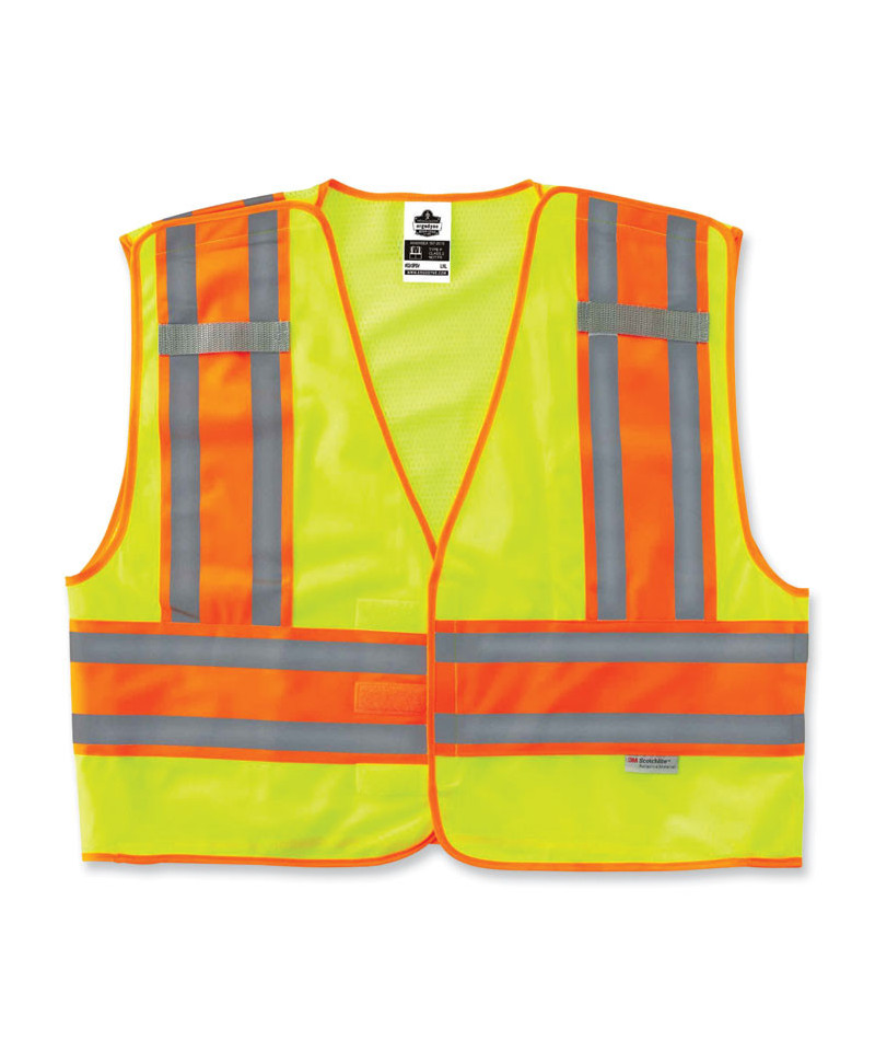 ANSI-compliant, two-tone public saftey vest with a breakaway design. Solid poly front with mesh back. Reflective strip set on 4.5 contrasting background for extra visibility. Features one multi-division inside pocket and dual radio mic tabs.
