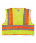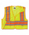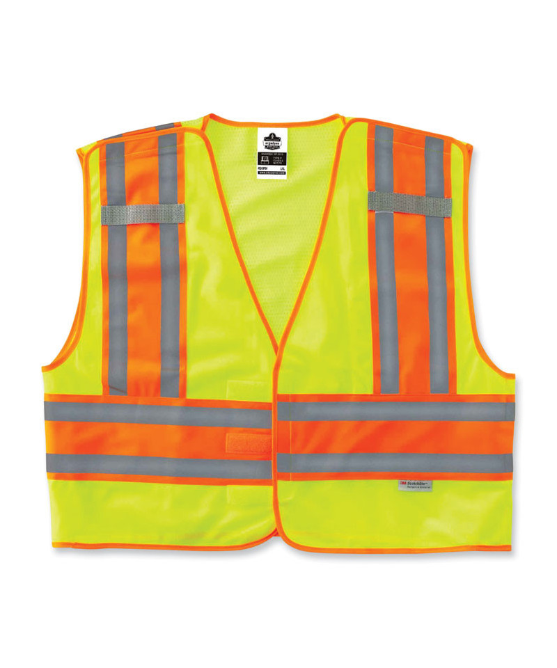 ANSI-compliant, two-tone public saftey vest with a breakaway design. Solid poly front with mesh back. Reflective strip set on 4.5 contrasting background for extra visibility. Features one multi-division inside pocket and dual radio mic tabs.