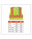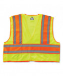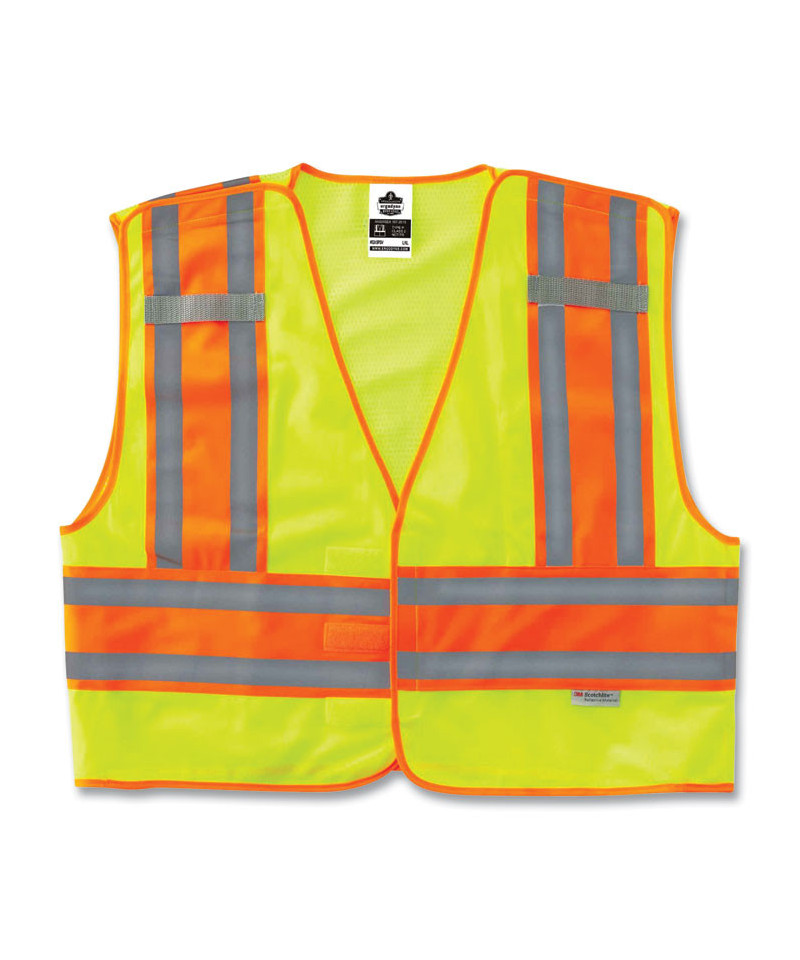 ANSI-compliant, two-tone public saftey vest with a breakaway design. Solid poly front with mesh back. Reflective strip set on 4.5 contrasting background for extra visibility. Features one multi-division inside pocket and dual radio mic tabs.