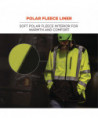 Features a 100% polyester shell with PU coating for water- and wind-resistant protection from the elements. A soft polar fleece lining adds warmth and comfort for cool environments and thumb loops trap heat and keep sleeves in place. Unlike typical boxy and bulky hi-vis gear, this lightweight jacket is designed for a more athletic fit.