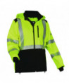 The GloWear 8353 Hi-Vis Softshell features a 100% polyester shell with PU coating for water- and wind-resistant protection from the elements. A soft polar fleece lining adds warmth and comfort for cool environments and thumb loops trap heat and keep sleeves in place. Unlike typical boxy and bulky hi-vis gear, this lightweight jacket is designed for a more athletic fit. Built for the worksite, the removable hood is large enough to be pulled up over hard hats and easily detaches when not needed. Adjustable hook and loop cuffs seal out cold and allow for comfortable wear with gloves. For a snug and custom fit that keeps cold air out, this softshell also features an elastic bungee waist and a long tail that won't ride up. A zippered closure makes for easy on and off. This Type R Class 3 lightweight hi-vis jacket features two lower front pockets, one upper chest cell phone pocket, three zippered interior pockets, and two D-rings for convenient access and storage.