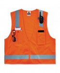 The GloWear 8249Z Surveyors Vest is an ANSI 107 Type R, Class 2 economy vest with a 3.6 oz polyester solid front and breathable 3.3 oz polyester mesh back. This hi-vis vest features 2" reflective tape for enhanced low-light visibility. With two interior and two exterior pockets, including a cell phone chest pocket, this vest provides ample storage for pens, notebooks, tablets and more. A single mic tab allows convenient radio access, and a zipper closure makes for easy on and off.