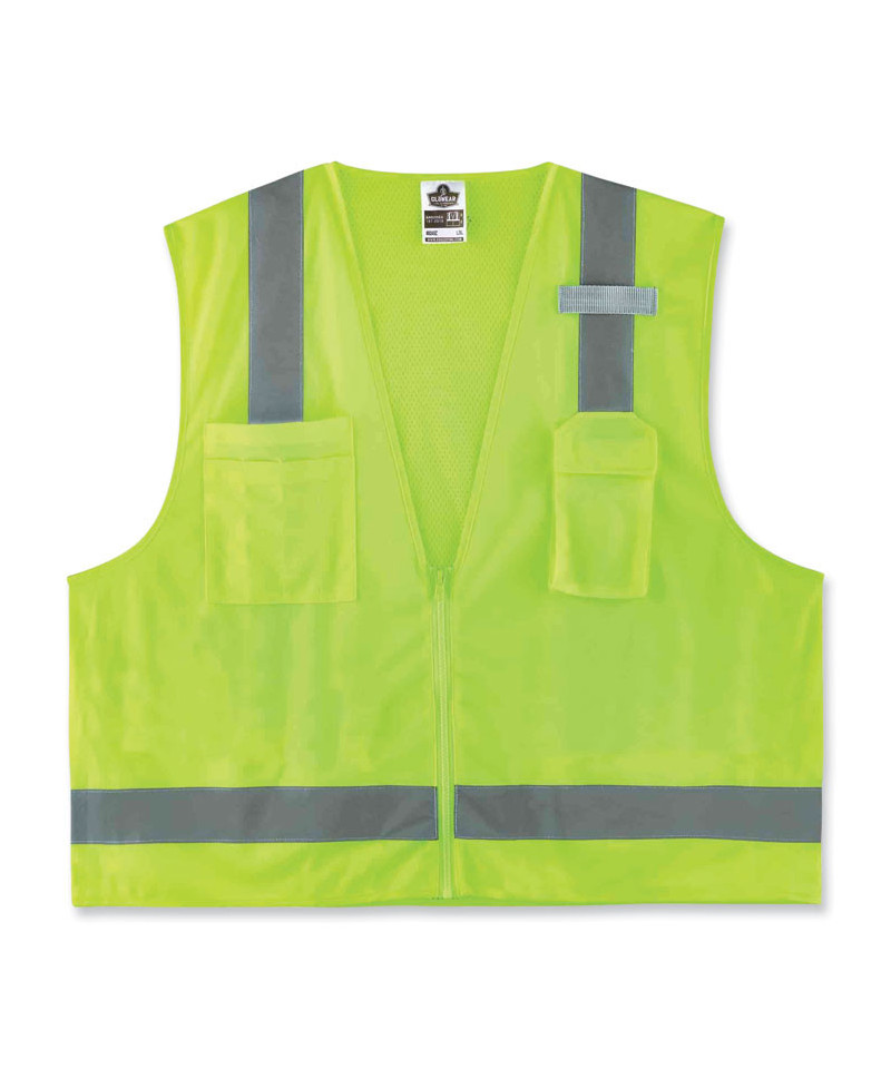 The GloWear 8249Z Surveyors Vest is an ANSI 107 Type R, Class 2 economy vest with a 3.6 oz polyester solid front and breathable 3.3 oz polyester mesh back. This hi-vis vest features 2" reflective tape for enhanced low-light visibility. With two interior and two exterior pockets, including a cell phone chest pocket, this vest provides ample storage for pens, notebooks, tablets and more. A single mic tab allows convenient radio access, and a zipper closure makes for easy on and off.