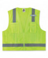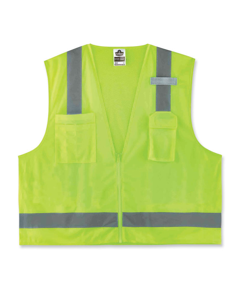 The GloWear 8249Z Surveyors Vest is an ANSI 107 Type R, Class 2 economy vest with a 3.6 oz polyester solid front and breathable 3.3 oz polyester mesh back. This hi-vis vest features 2" reflective tape for enhanced low-light visibility. With two interior and two exterior pockets, including a cell phone chest pocket, this vest provides ample storage for pens, notebooks, tablets and more. A single mic tab allows convenient radio access, and a zipper closure makes for easy on and off.