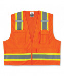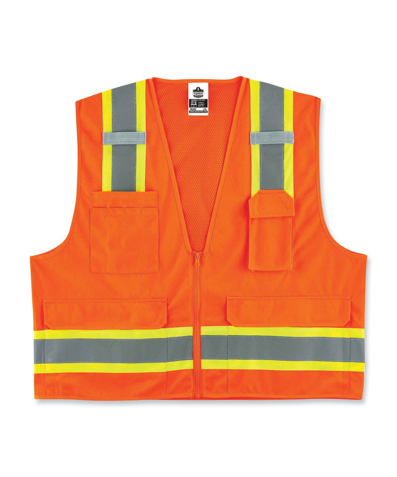 The GloWear 8248Z Class 2 Surveyors Vest has a solid front, mesh back and zipper closure. Two-tone design. Lots of pockets, two inside and four outside pockets. What's not to love? Features 2 ANSI-compliant reflective. Reflective is set on 3.5 contrasting background. Dual radio mic tabs.