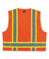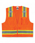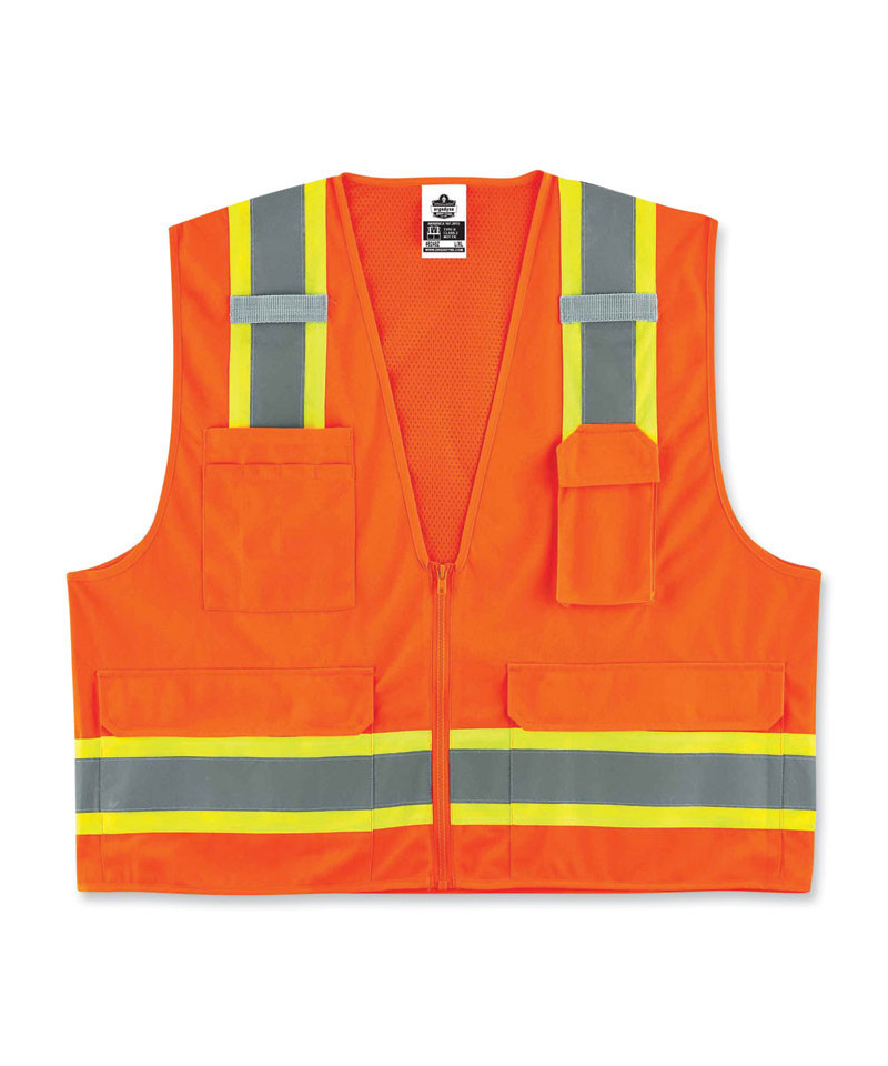 The GloWear 8248Z Class 2 Surveyors Vest has a solid front, mesh back and zipper closure. Two-tone design. Lots of pockets, two inside and four outside pockets. What's not to love? Features 2 ANSI-compliant reflective. Reflective is set on 3.5 contrasting background. Dual radio mic tabs.