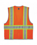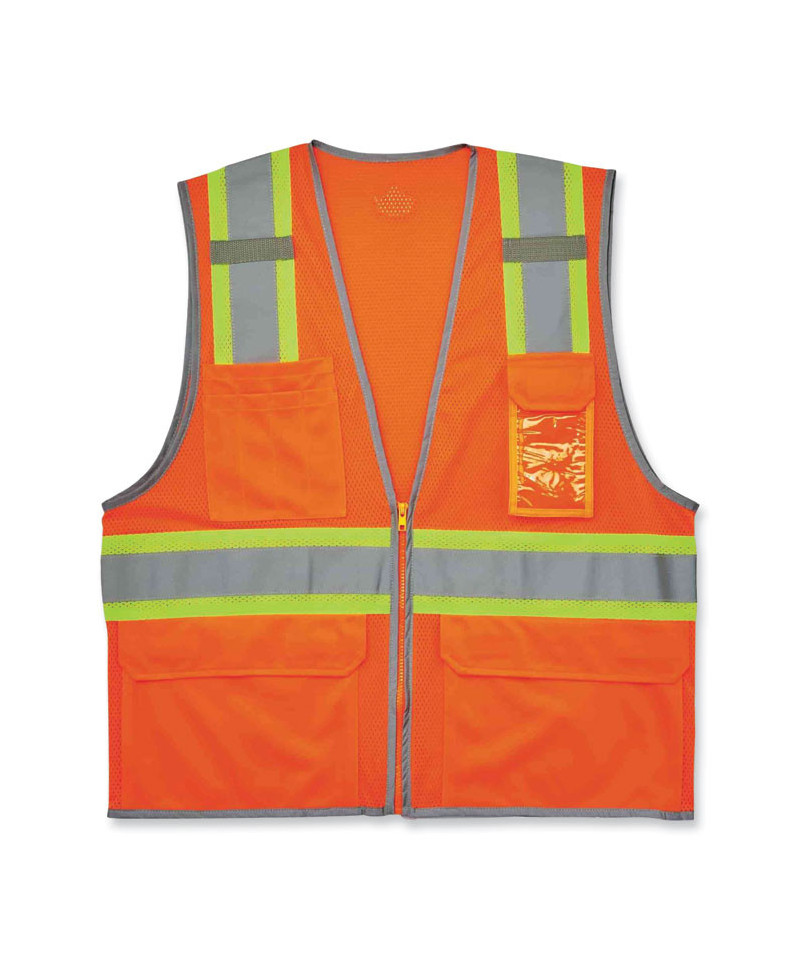 The GloWear 8246Z Mesh Two-Tone Safety Vest is an ANSI 107 Type R, Class 2 economy vest made of 3.3 oz polyester mesh. This hi-vis vest features 2" reflective tape set on a 3.5 contrasting mesh background and reflective piping for enhanced visibility. Built for storage, this vest has two interior and four exterior pockets, a clear ID badge holder and dual radio mic tabs. A zipper closure makes for easy on and off.