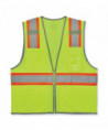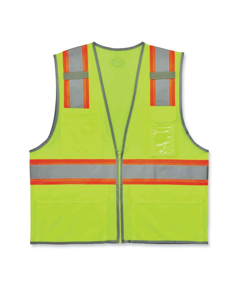 The GloWear 8246Z Mesh Two-Tone Safety Vest is an ANSI 107 Type R, Class 2 economy vest made of 3.3 oz polyester mesh. This hi-vis vest features 2" reflective tape set on a 3.5 contrasting mesh background and reflective piping for enhanced visibility. Built for storage, this vest has two interior and four exterior pockets, a clear ID badge holder and dual radio mic tabs. A zipper closure makes for easy on and off.