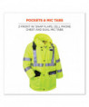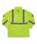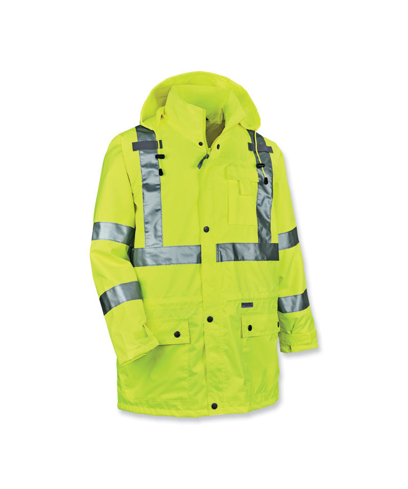 The GloWear 8365 Hi-Vis Rain Jacket is a Type R, Class 3 jacket that offers waterproof, breathable protection against the elements. Made with a breathable polyester shell that keeps water out while letting moisture escape to keep you cool and comfortable working in the worst conditions. This reflective rain jacket has 2 ANSI compliant 3M Scotchlite Reflective material on the chest and arms for added visibility at night or in low-light conditions. The inset hood can be tucked away when not needed. This waterproof work jacket offers comfortable protection against the elements for those working in road construction, utilities, construction, emergency response, airline, railway or survey crews.